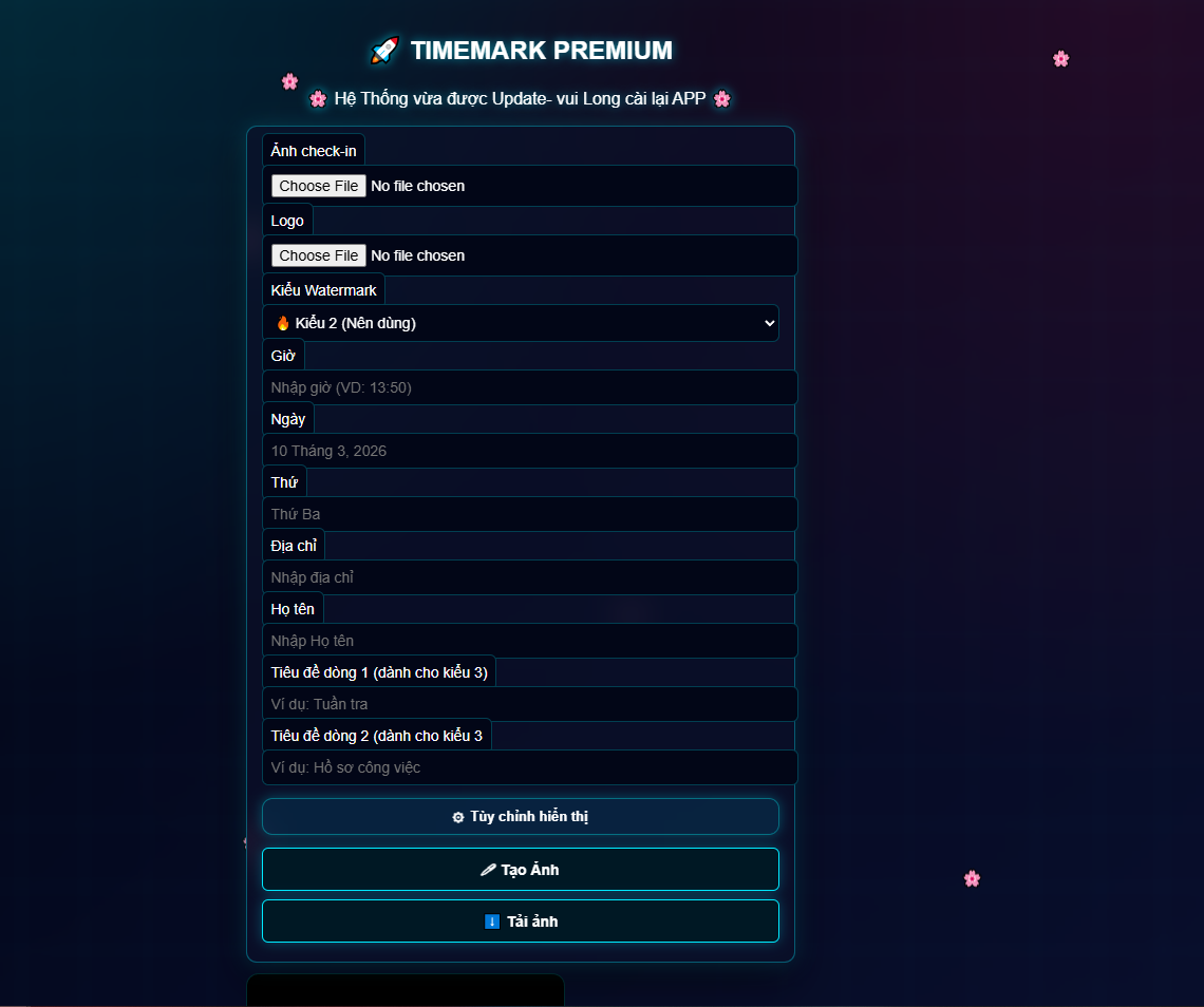 Timemark giúp bạn tạo ảnh check-in với vị trí và thời gian tùy chỉnh hoàn toàn, đảm bảo xác thực chuẩn 100% trên hệ thống.